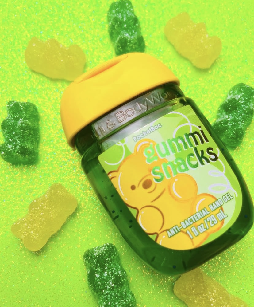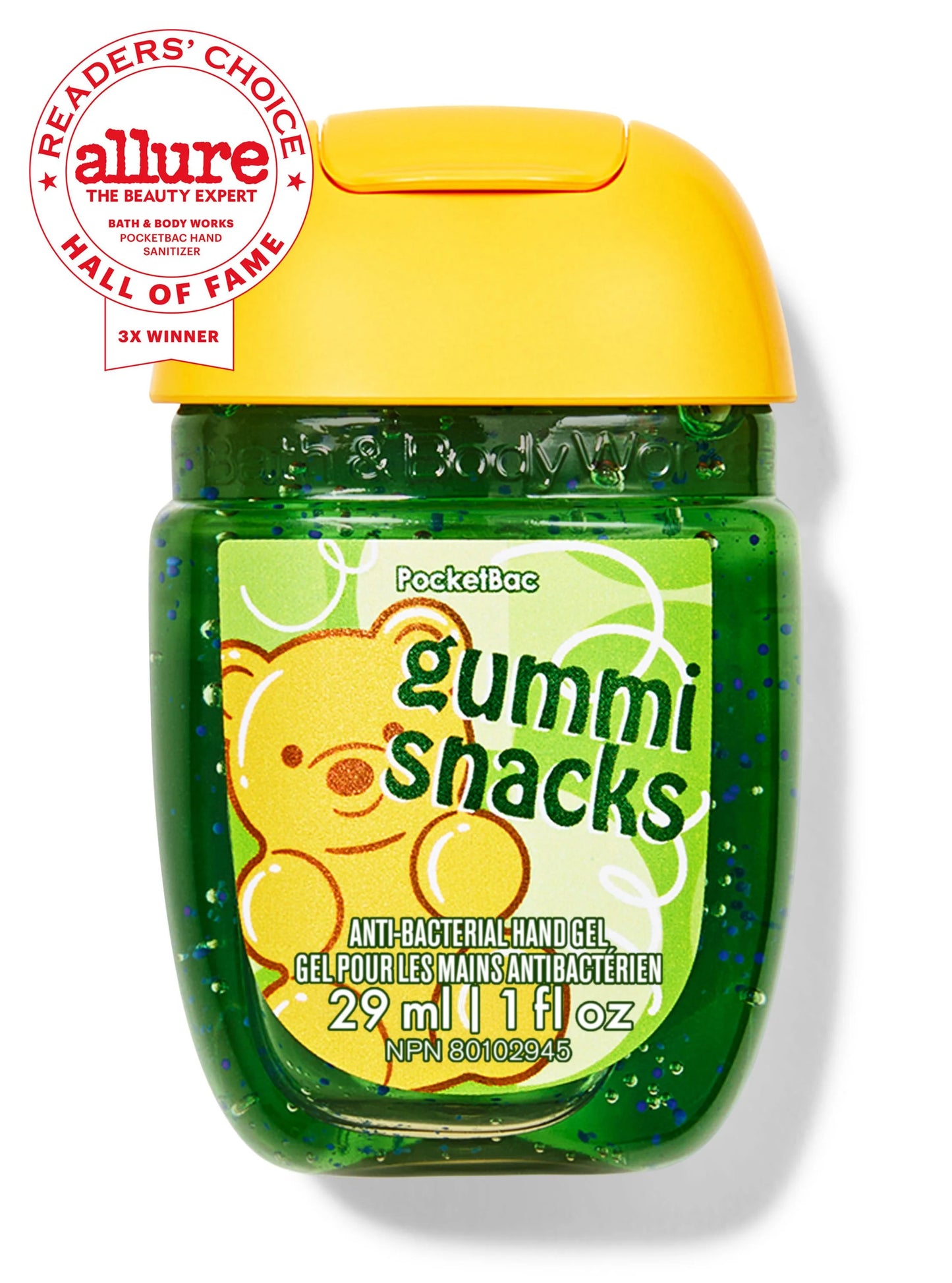Gel de manos Bath & body Works gummy snacks con aroma a una explosión dulce y refrescante que recuerda a las golosinas de frutas de gelatina (gomitas)la fragancia combina notas afrutadas con un toque dulce y tropical,evocando la experiencia cia de comer ositos de goma.