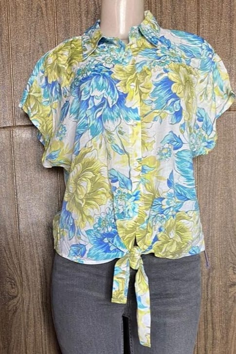 Blusa Caroly Taylor de estampado floral en tonos azul, verde y amarillo, con diseño moderno de nudo frontal. Ideal para un look veraniego, casual y lleno de color.