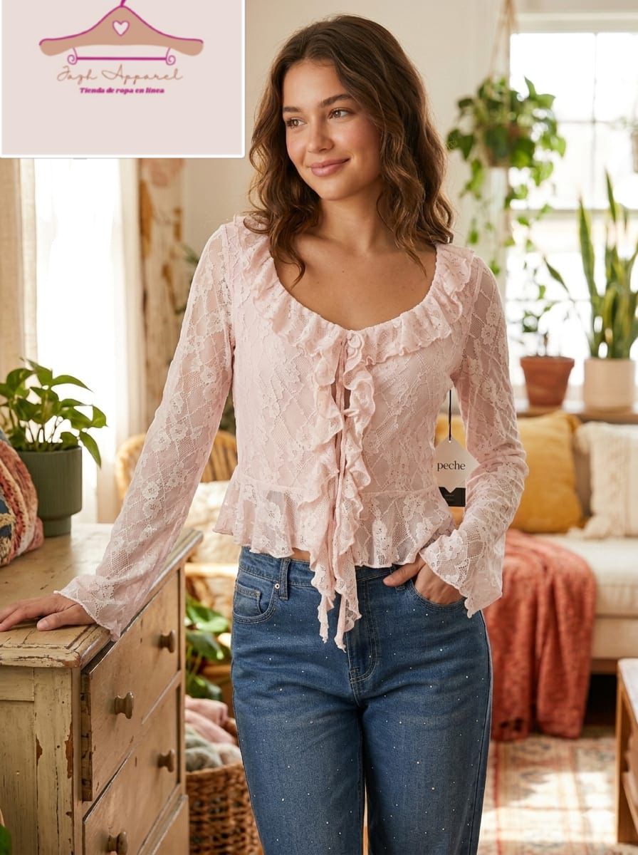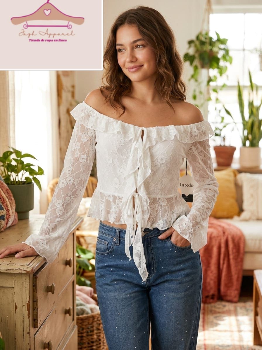 Enamora con la delicadeza de la blusa de blonda La Peche. Con un diseño romántico de encaje floral, volantes frontales y un toque bohemio, esta prenda es ideal para lograr un look femenino y sofisticado. Disponible en los tonos más buscados de la temporada: Blanco Clásico y Durazno Suave.