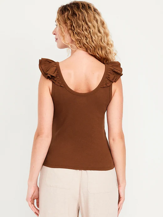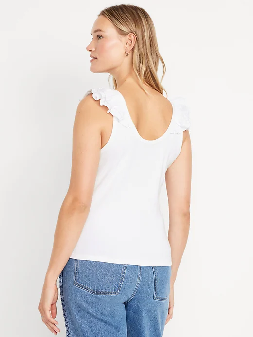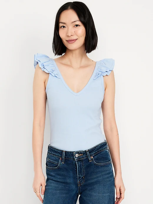 Blusa Snug Ribbed de Old Navy con delicados volantes en los hombros, ideal para un look fresco y femenino. Disponible en varios colores y tallas.