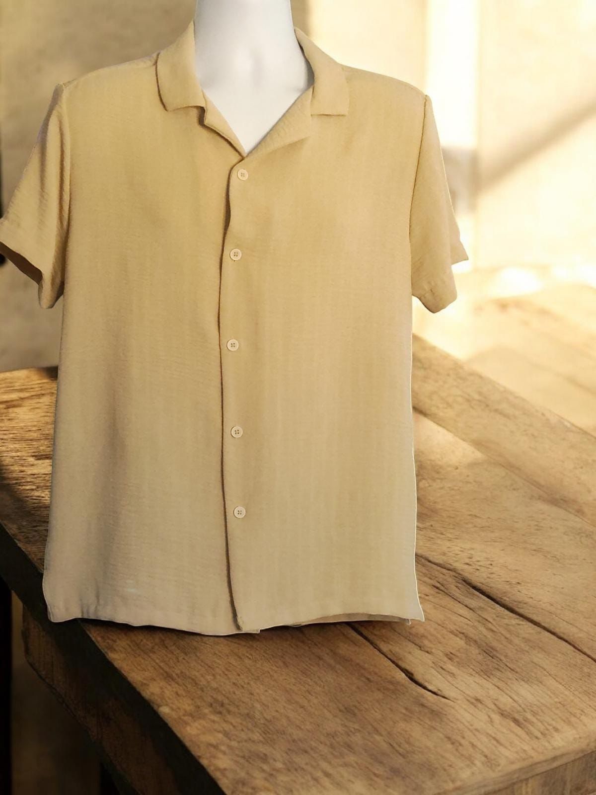 Versatilidad de Color: El tono beige tierra es atemporal y combina perfectamente con pantalones de lino blancos, jeans azules o bermudas en tonos oscuros.