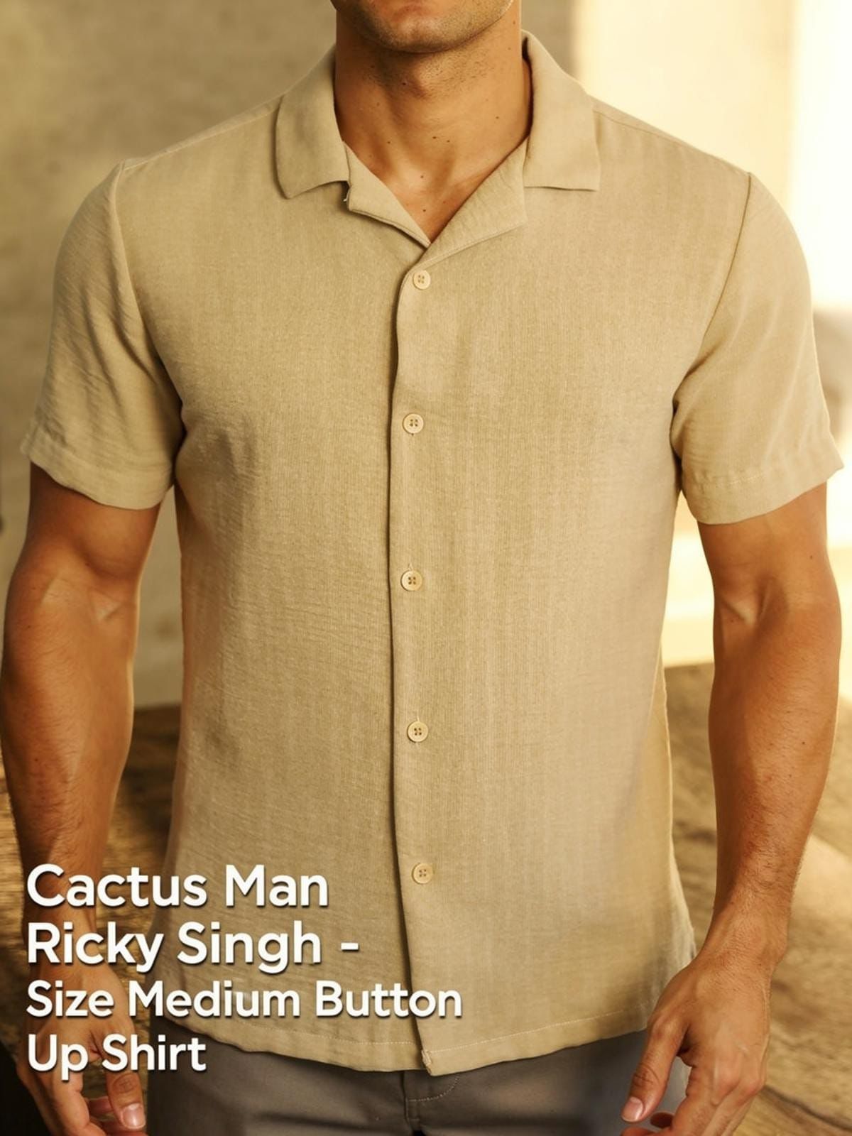 Disfruta de la frescura y el estilo impecable con esta camisa Cactus Man de la colección Ricky Singh. Confeccionada en un tono beige arena y con un diseño de botones al frente, su tejido ligero con textura tipo lino la convierte en la prenda ideal para climas cálidos y ocasiones casuales con un toque sofisticado.