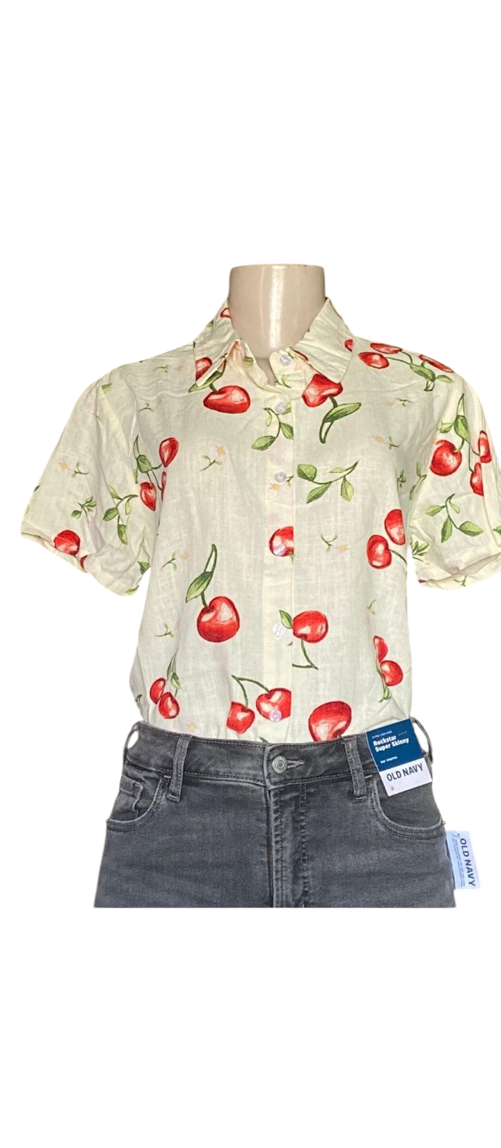 Cuenta con manga corta, cuello clásico y botonadura frontal completa, lo que te permite usarla cerrada o abierta como sobrecamisa. El estampado de cerezas en tonos vibrantes destaca sobre el fondo claro, creando un look llamativo, juvenil y súper combinable.