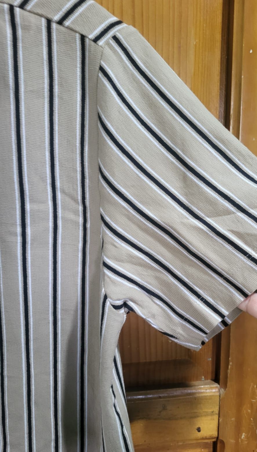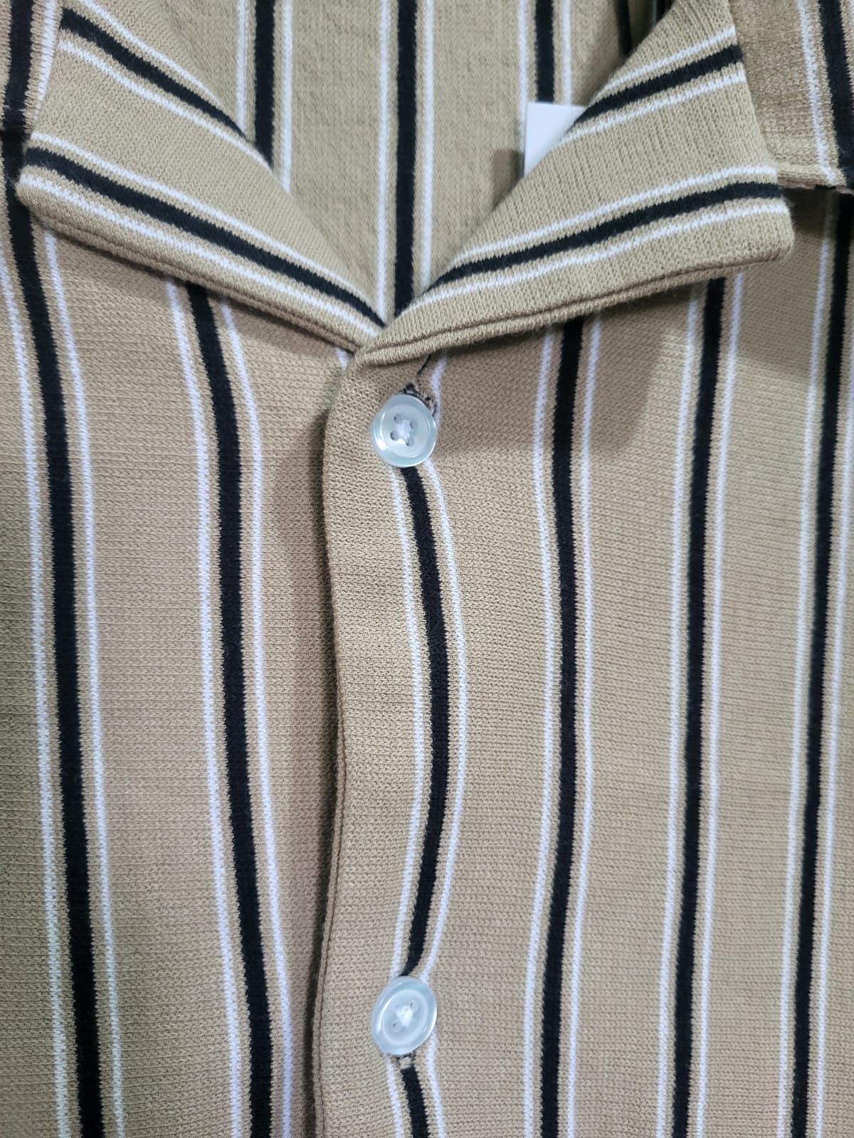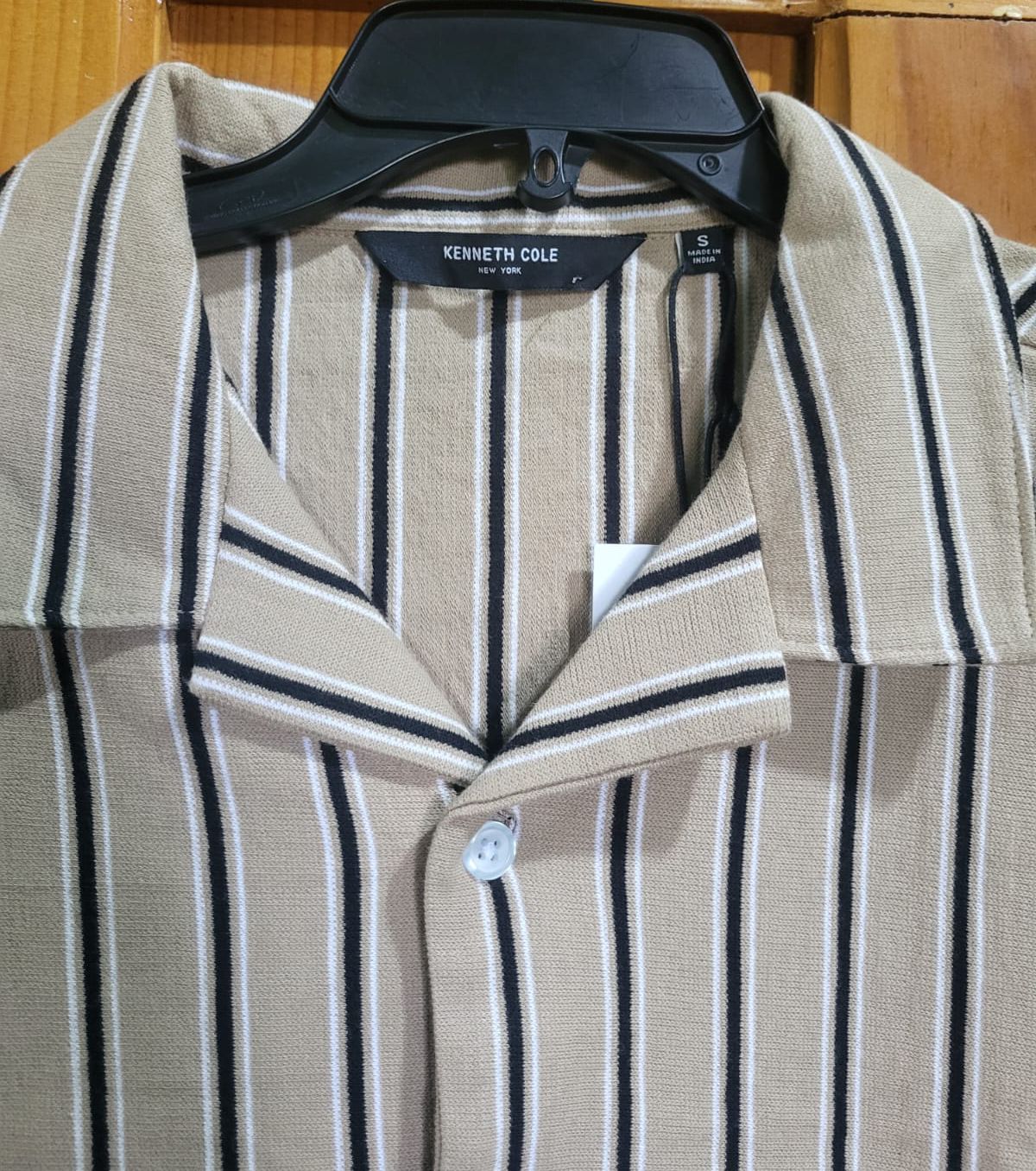 Define tu estilo de temporada con esta camisa Kenneth Cole de corte cubano. Con un sofisticado tono café claro y rayas verticales negras, esta prenda de manga corta ofrece un equilibrio perfecto entre la elegancia clásica y la frescura moderna. Ideal para vacaciones, eventos casuales o un look urbano relajado.