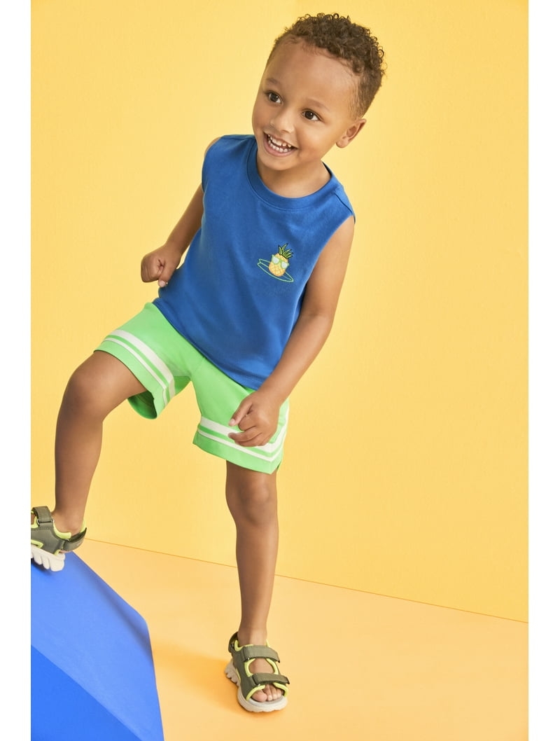 Esta camisa sin mangas para niño marca Garanimals combina comodidad y estilo en una prenda fresca y moderna. Fabricada en suave algodón, ofrece una textura ligera ideal para el verano o actividades al aire libre. Su diseño en color azul brillante incluye un pequeño estampado de piña con gafas de sol, que aporta un toque divertido y tropical. Perfecta para combinar con shorts o jeans, esta camiseta es una opción versátil para el guardarropa diario de tu pequeño.