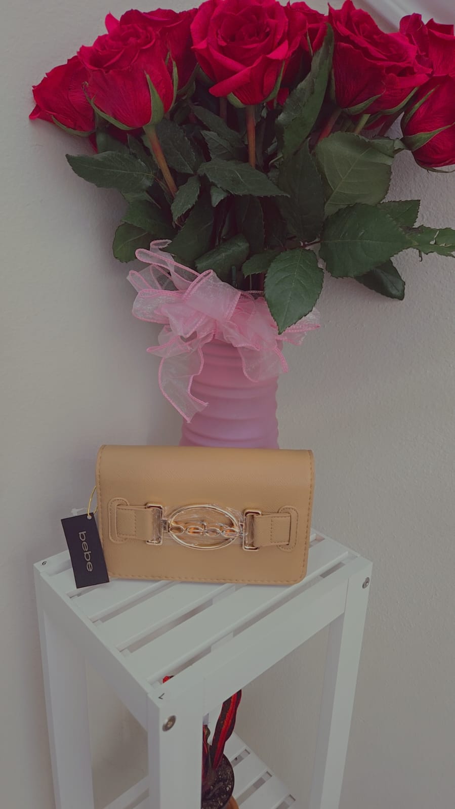 Cartera BEBE en color beige con detalle de hebilla dorada al frente. Un diseño moderno, sofisticado y versátil que complementa cualquier look con estilo.