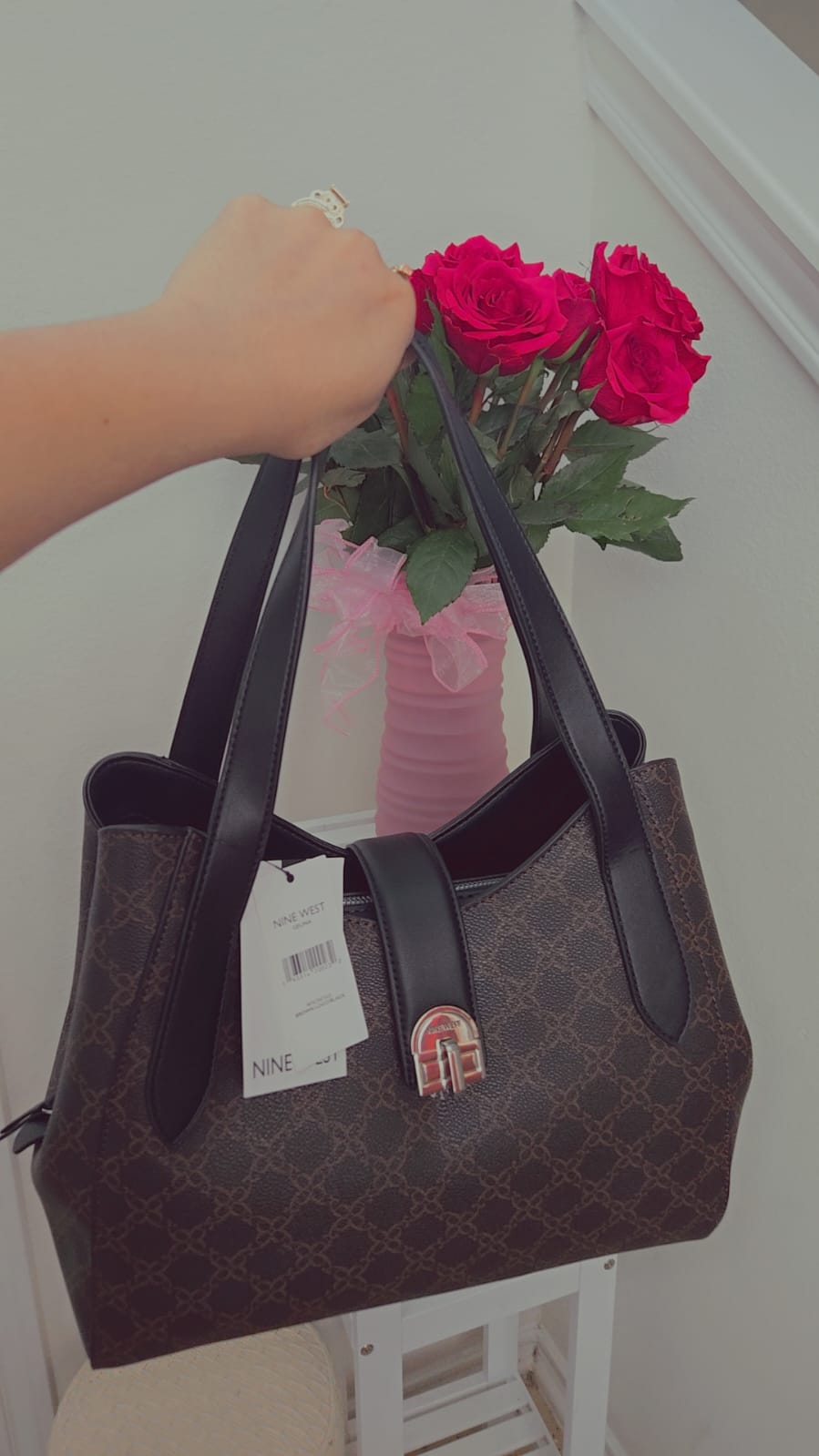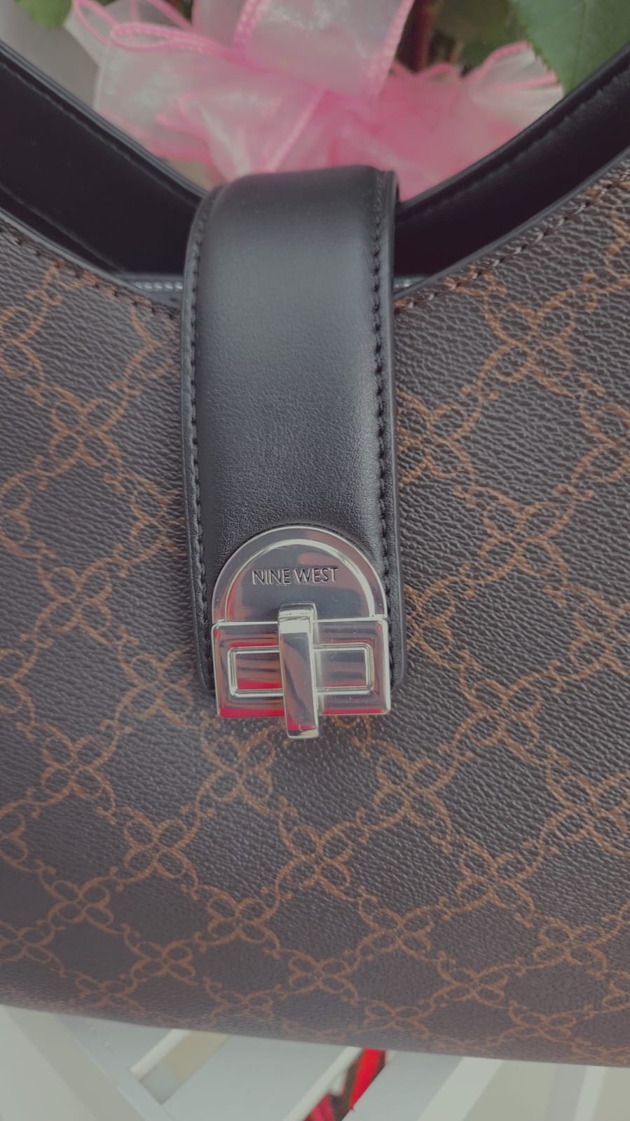 Su estructura firme y espaciosa permite llevar todos tus esenciales del día a día —celular, billetera, maquillaje y más— sin perder el estilo. El cierre metálico frontal con logo Nine West añade un toque sofisticado, mientras que las asas dobles ofrecen comodidad para llevarla al hombro o en la mano.