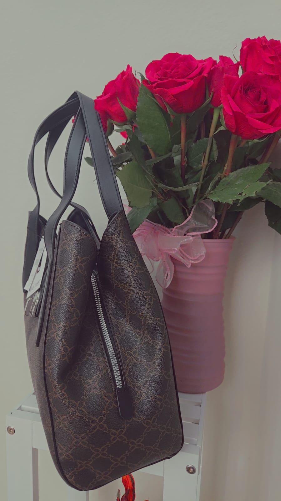 La cartera Nine West es el accesorio ideal para mujeres que buscan elegancia, comodidad y estilo en un solo bolso. Confeccionada con materiales de alta calidad, presenta un diseño tipo tote bag en color café oscuro con detalles negros y el distintivo patrón monogramado de la marca.