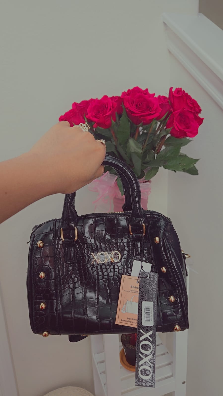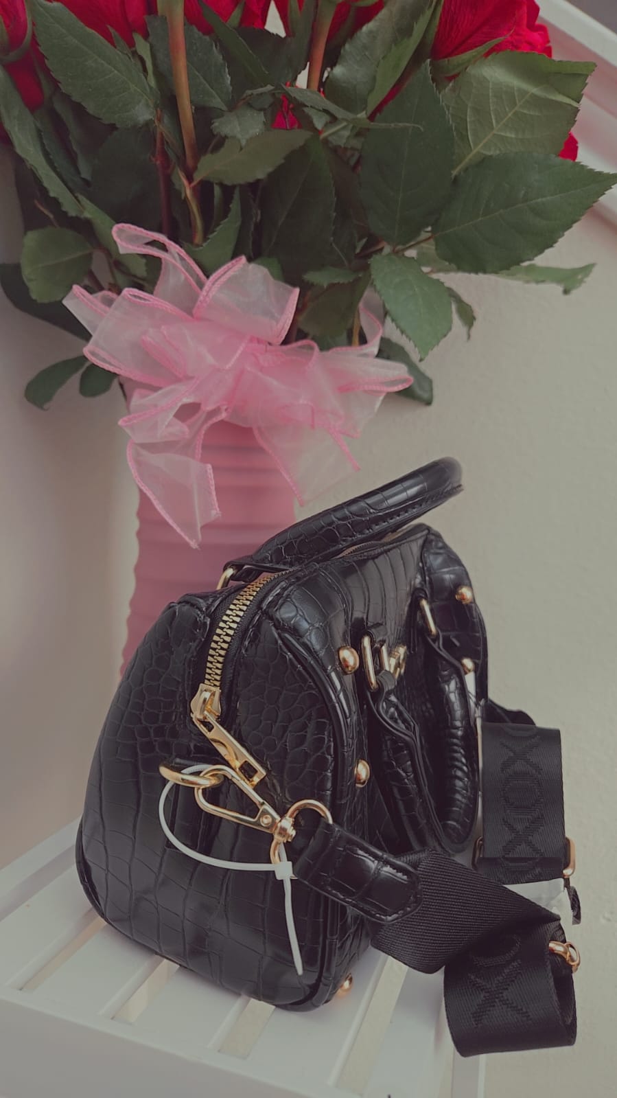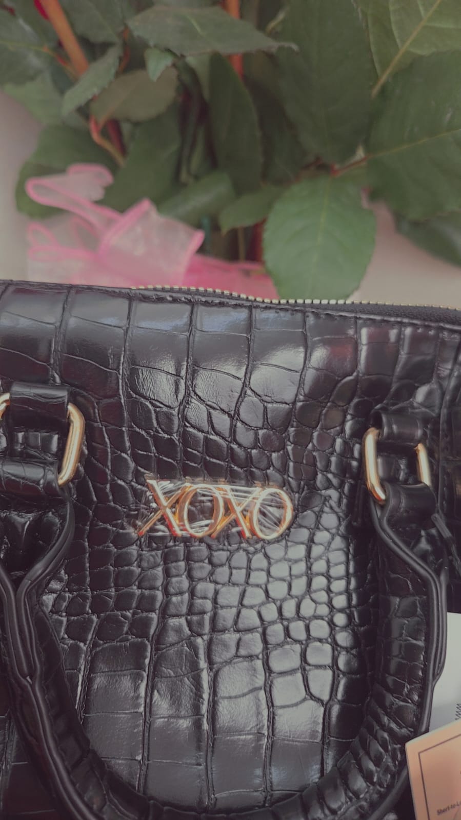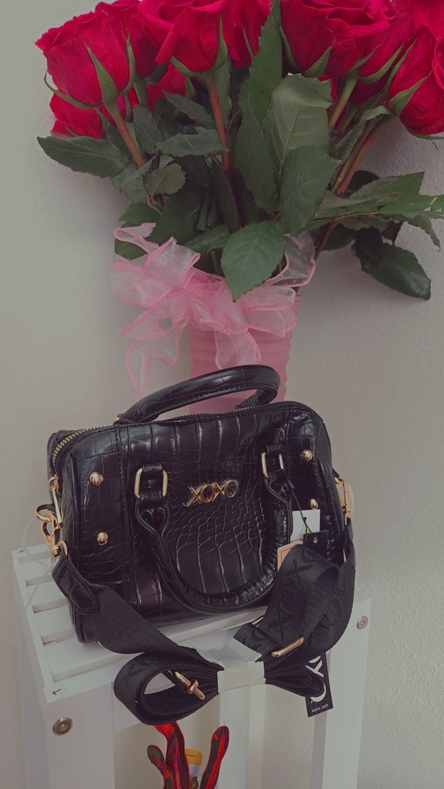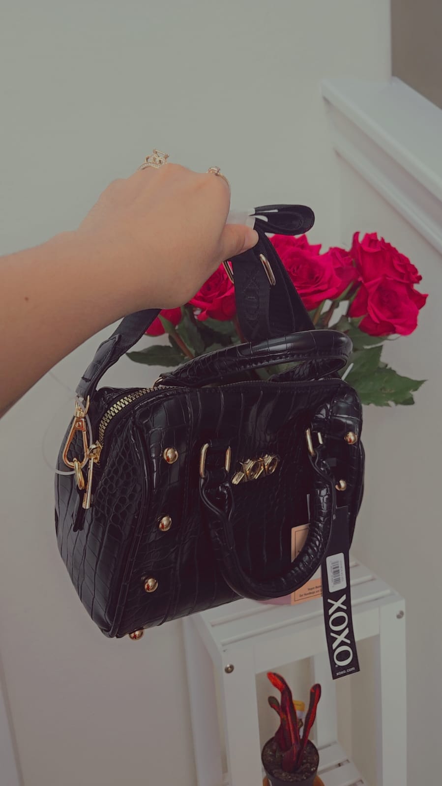 Cartera XOXO en color negro con textura tipo cocodrilo y herrajes dorados. Un bolso sofisticado, moderno y funcional, ideal para cualquier ocasión.