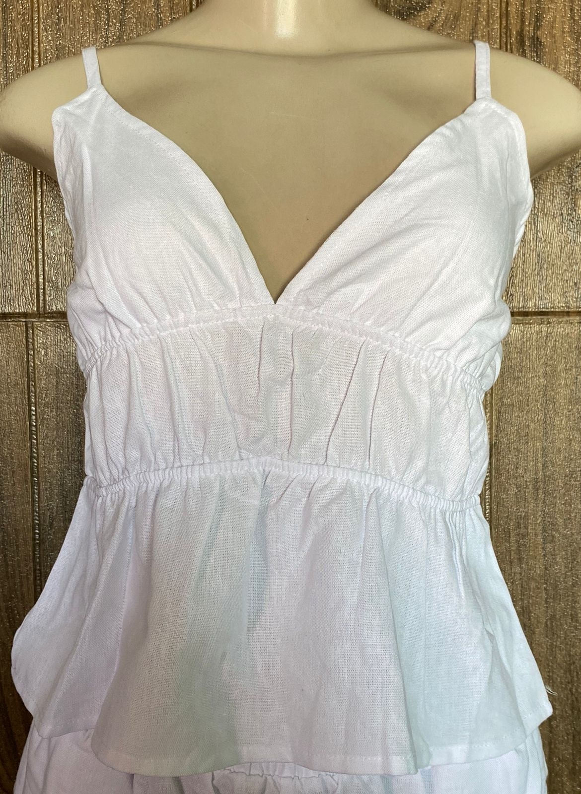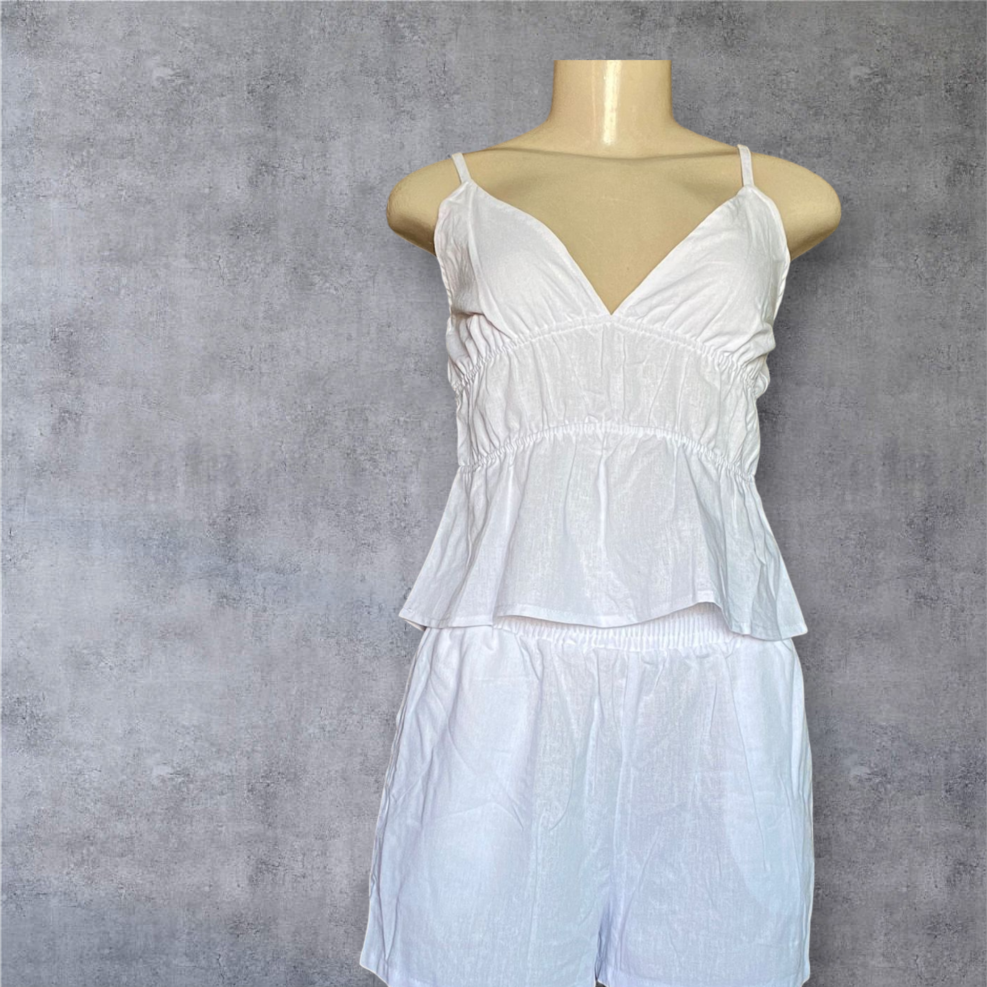 Conjunto New Look de dos piezas en color blanco, súper fresco y cómodo. Incluye blusa ligera con tirantes y short de pretina elástica, ideal para verano o días relajados.
