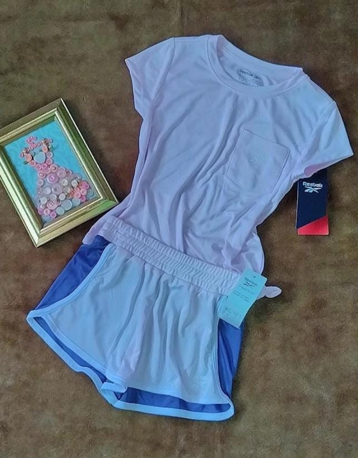 Conjunto Reebok de 3 piezas para niña, incluye dos camisetas y un short deportivo. Ideal para actividades diarias o entrenamientos, con diseño cómodo, moderno y ligero.