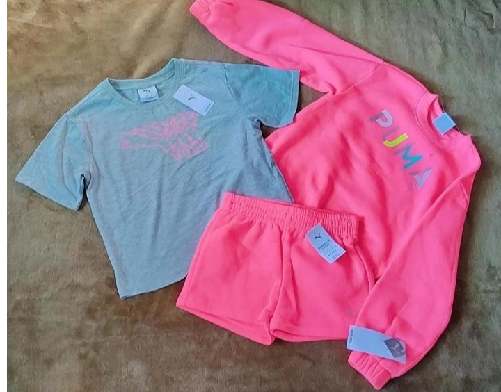 Este hermoso conjunto Puma para niña de 3 piezas combina moda, calidad y confort. Incluye una sudadera rosa neón con el logo colorido de la marca, una camiseta gris con el clásico logotipo Puma y un short a juego en tono rosa. Perfecto para actividades diarias, juegos o salidas casuales.