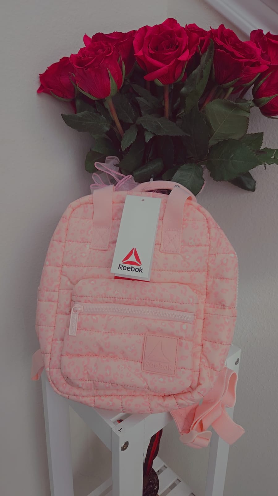 Mochila Reebok rosa con diseño acolchado y estampado sutil. Ligera, moderna y perfecta para el día a día o actividades deportivas.