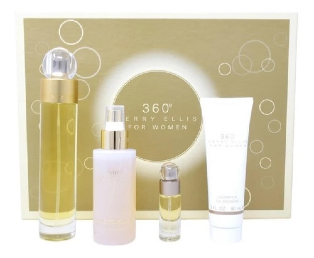 El Set Perry Ellis 360° for Women EDP incluye perfume de 100ml, body mist, gel de baño y mini perfume. Una fragancia floral y fresca, perfecta para mujeres elegantes y seguras.