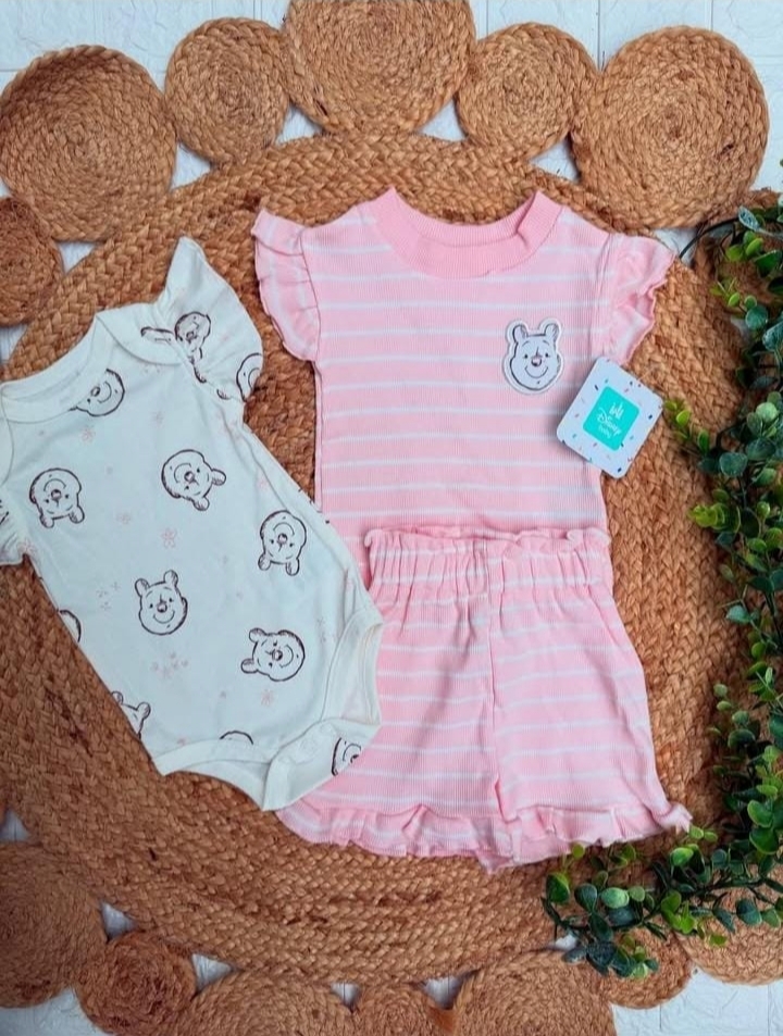 Tierno set de 2 piezas Disney para bebé, con camiseta y short en tonos rosa con estampado de Winnie the Pooh. Ideal para mantener a tu pequeña cómoda y con estilo todos los días.