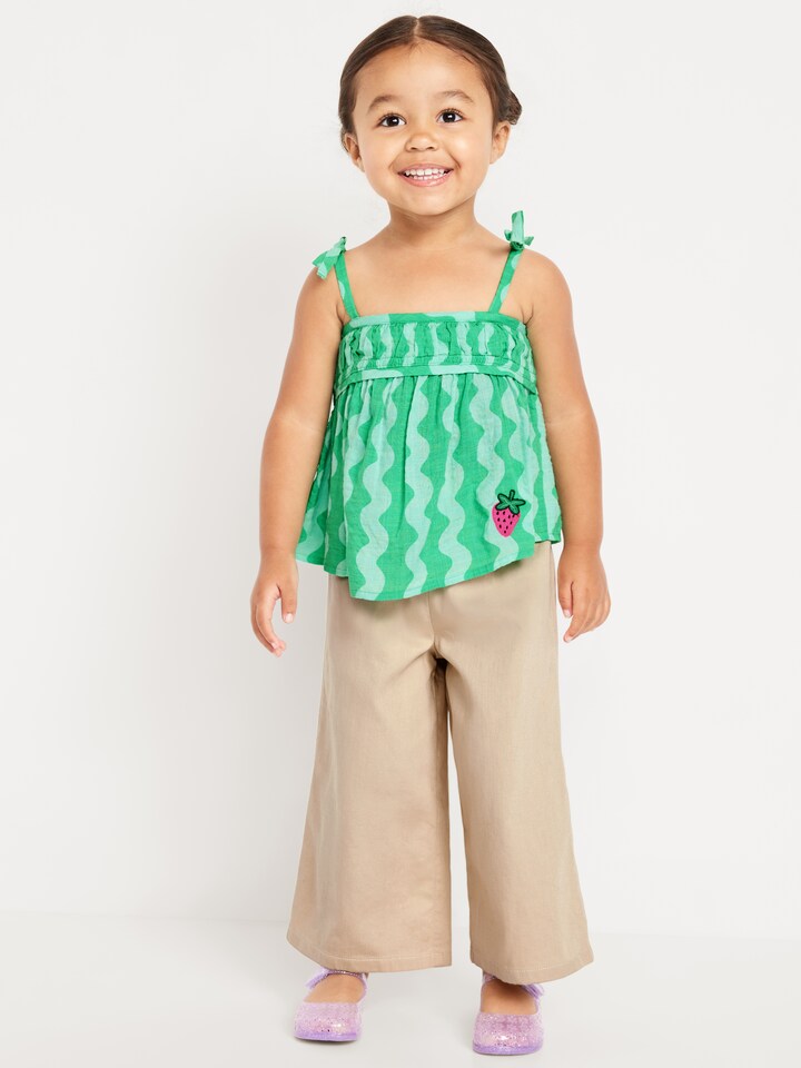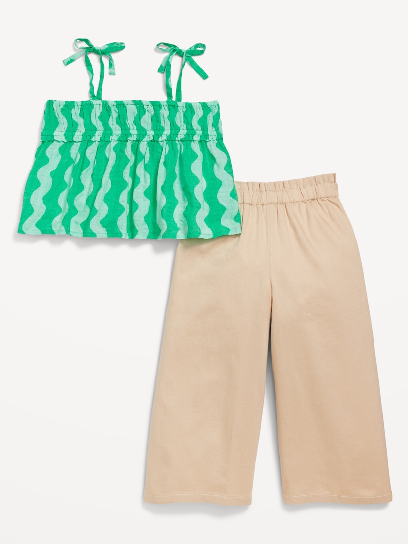 Set Old Navy para niña con blusa verde de tirantes ajustables y pantalón beige tipo pantaloneta, ideal para días cálidos con estilo y comodidad.