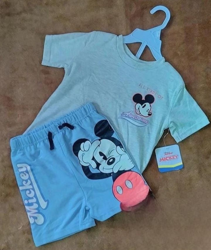 Set de 2 piezas para niño con diseño de Mickey Mouse. Incluye camiseta gris y short celeste, cómodos y frescos, ideales para uso diario.