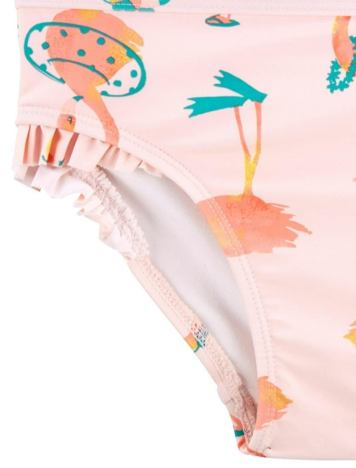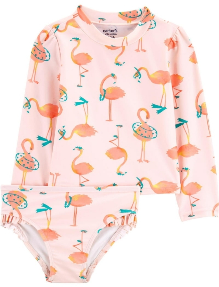 Traje de baño Carter’s para niña talla 4T, de dos piezas con divertido estampado de flamencos. Ideal para días de piscina o playa con estilo y protección.