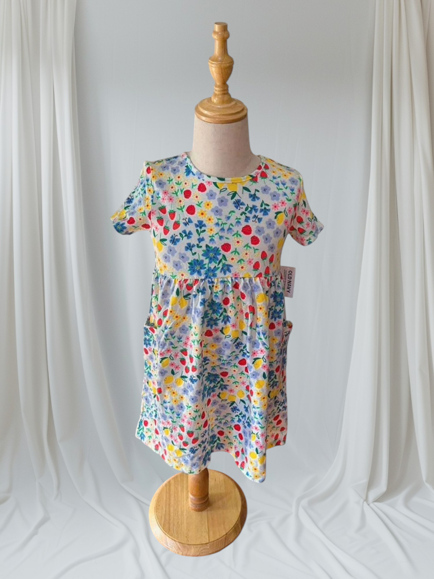 Hermoso vestido para niña marca Old Navy con divertido estampado frutal. Suave, cómodo y perfecto para cualquier ocasión casual o de paseo.